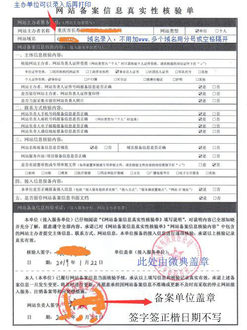 9、 核验单(主办单位名称和域名可以电脑录入打印)填写模版